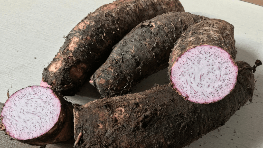 O inhame é uma raiz tuberosa rica em fibras, vitamina C, vitamina B6 e potássio. Conta com propriedades antioxidantes, auxilia na digestão, fortalece o sistema imunológico e pode contribuir para a saúde do sistema reprodutor feminino.
