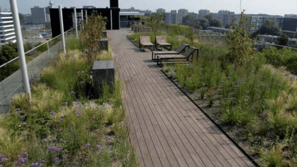 11 acres de telhados verdes capturando água da chuva em Amsterdã, prevenindo inundações.