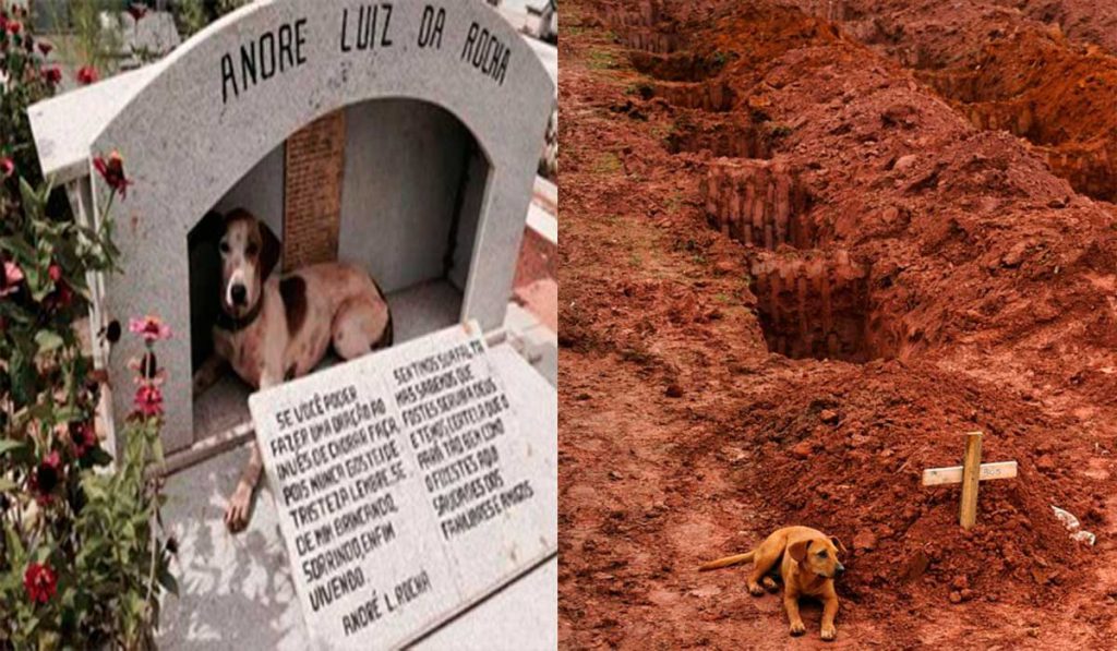 A foto rodou a internet e mostra um cachorro vivendo sob a lápide do dono num cemitério.
