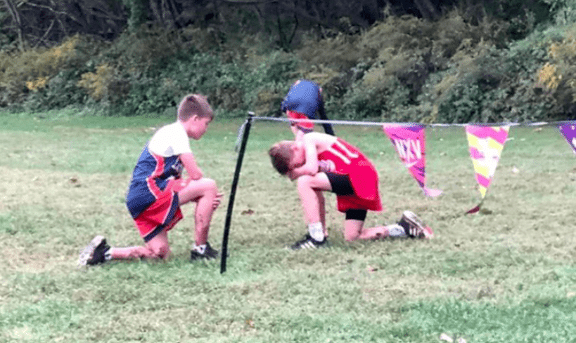 Cooper Kohanski se solidarizou com o colega ao vê-lo agachado, chorando. Foi quando o menino resolveu ajudá-lo e ficou ao lado dele para incentivar o concorrente a cruzar a linha de chegada.