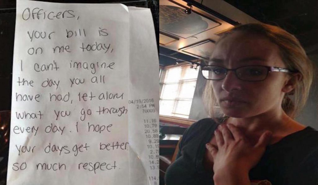 “Policiais, sua conta é minha hoje. Eu nem posso imaginar o dia que você tiveram, e o lixo que vocês recebem todos os dias. Espero que você tenham dias melhores. Muito respeito!”