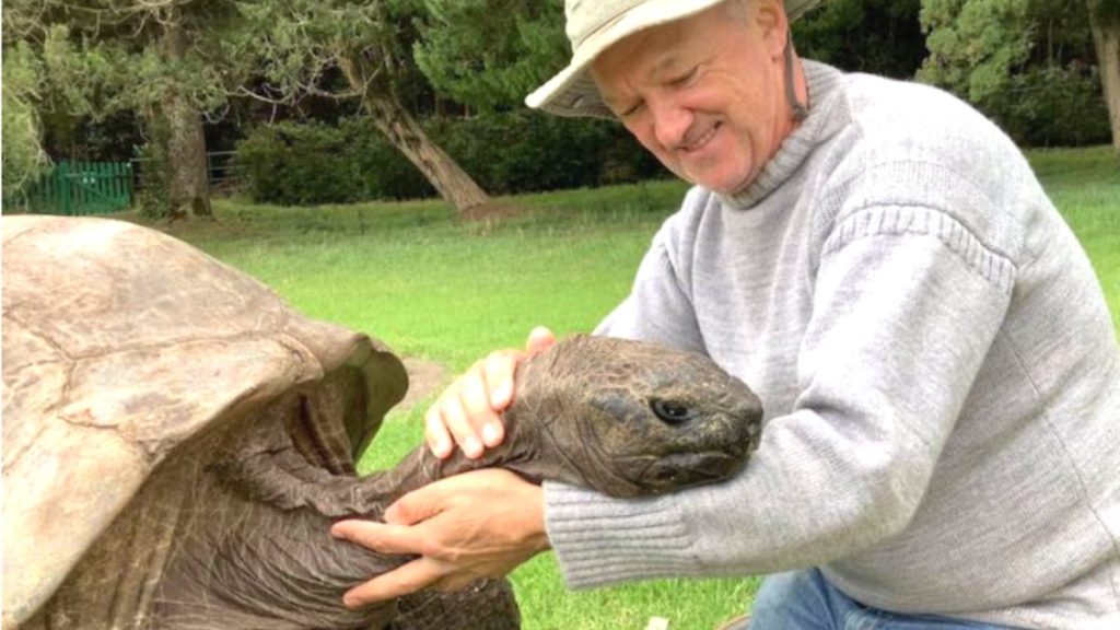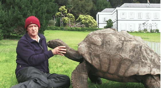 Joe Hollins, cuidou da tartaruga gigante durante suas décadas como veterinário residente em Santa Helena, e ainda o faz agora, durante sua aposentadoria.
