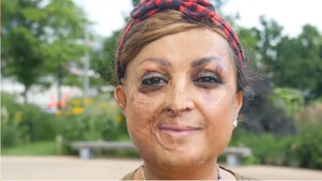A indiana, sofreu queimaduras de segundo e terceiro graus em 45% no rosto e no corpo.