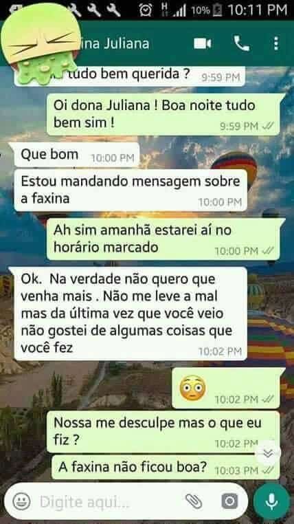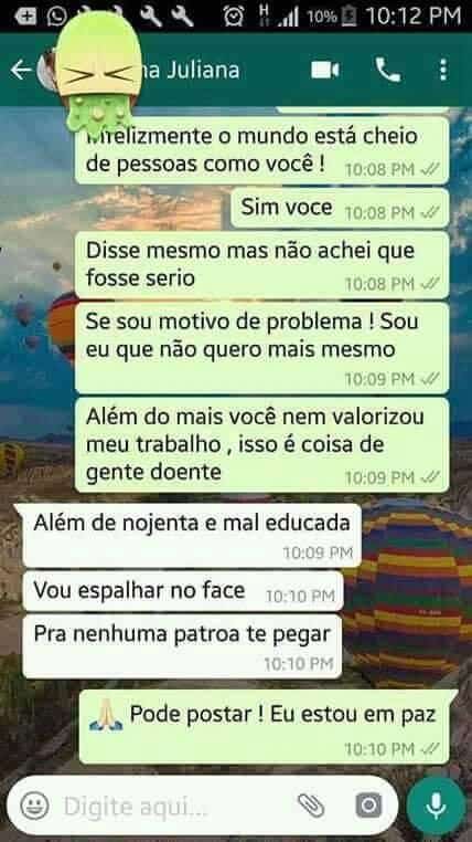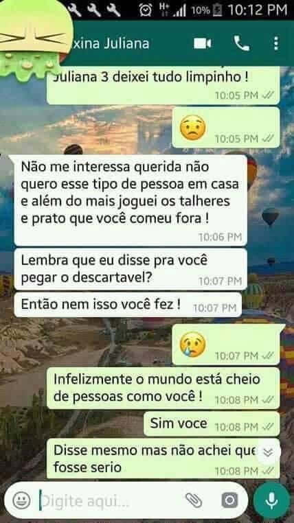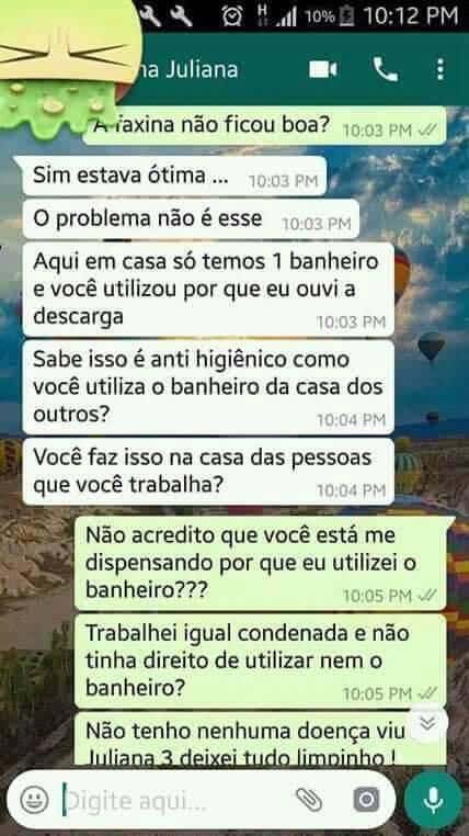 Após fazer a faxina, a empregada foi insultada com falas absurdas por parte da dona da casa. Coisas como ” Aqui em casa só temos 1 banheiro e você utilizou por que eu ouvi a descarga. Sabe isso é anti higiênico”, disse Juliana, a dona da casa.