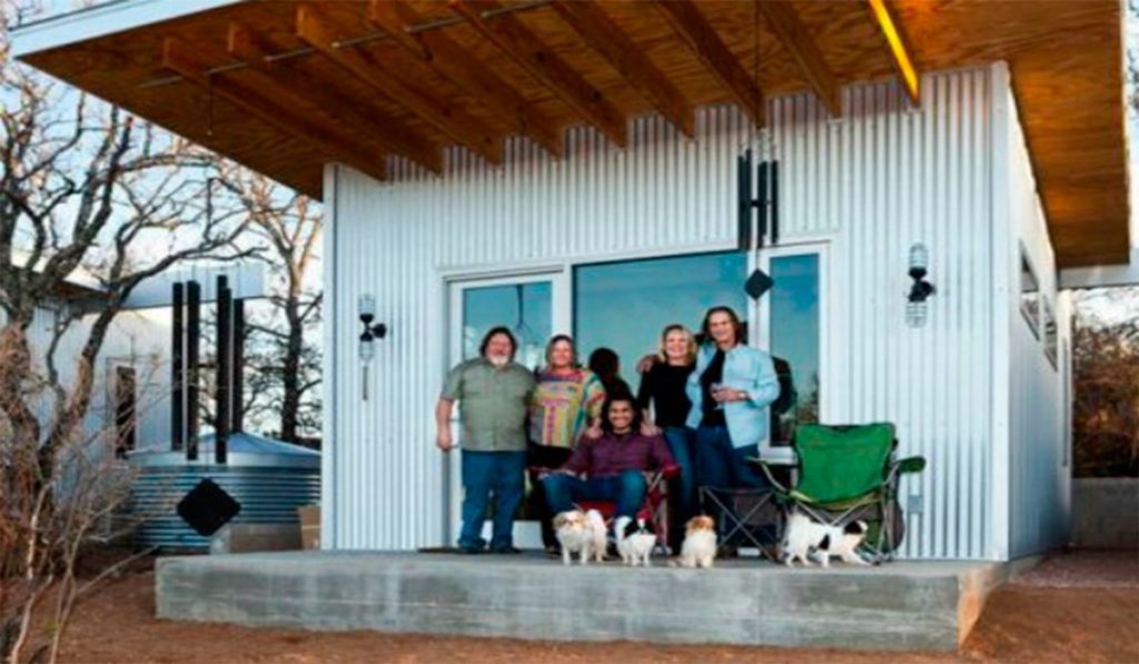 São 4 casas de pouco mais de 32 metros quadrados e uma construção maior para as visitas. Os oito juntaram suas economias e levaram o projeto adiante batizando a vila de Llano Exit Strategy. As quatro casas são muito confortáveis e fica na margem do Rio Llano, no Texas, EUA. Existe espaço para uma cama de casal, uma pequena cozinha e um banheiro. Na frente das casas eles contam com um espaço maior com uma cozinha comunitária e sala de jantar, onde todos se reúnem para as refeições. Para receber as visitas eles fizeram uma grande sala de estar com acomodações. Matt Garcia foi o responsável por projetar essas casas que ficaram assim:
