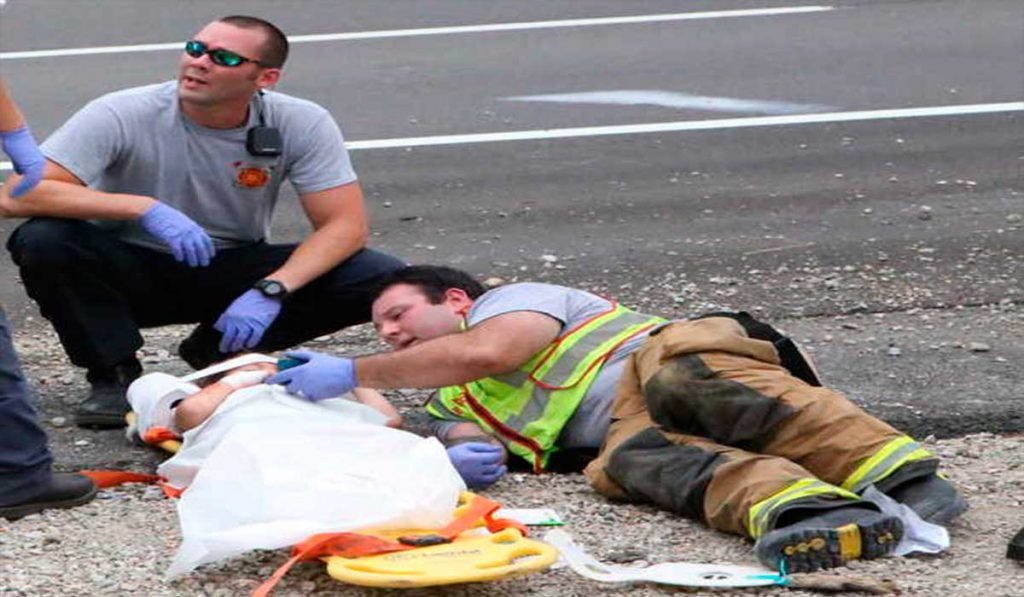 Nela, o bombeiro Casey Lessard aparece consolando e acalmando uma criança ferida em um acidente de carro no Mississipi, Estados Unidos.