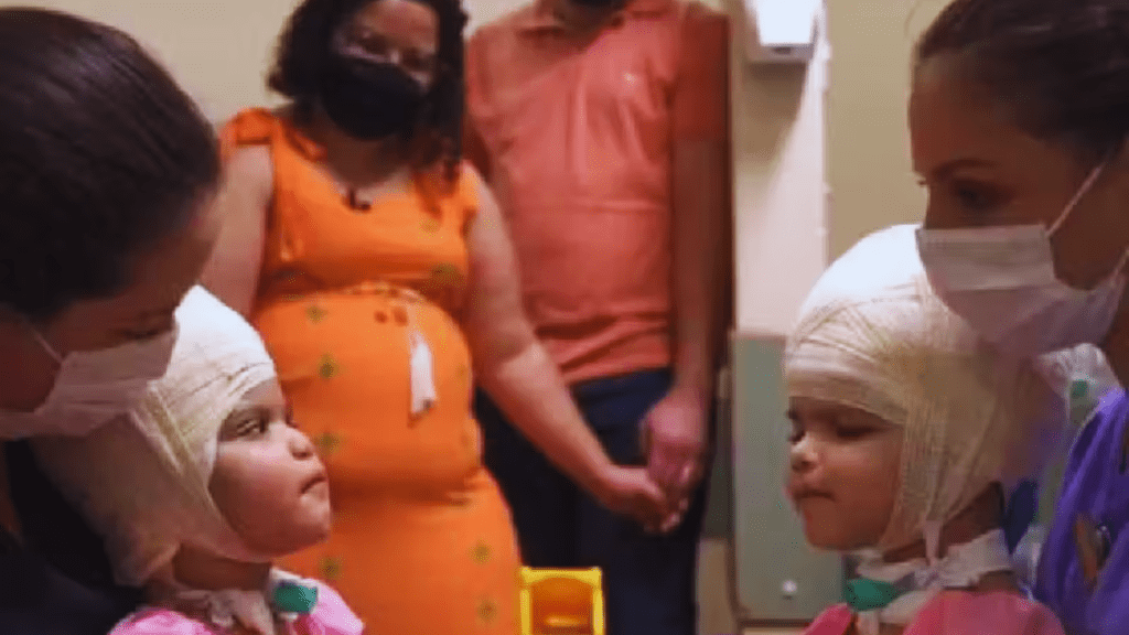 Após cirurgia, gêmeas siamesas ficam frente a frente primeira vez.