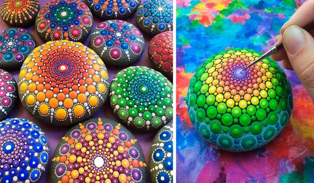 Artista pinta pedras do mar com milhares de pontos minúsculos para criar mandalas coloridas