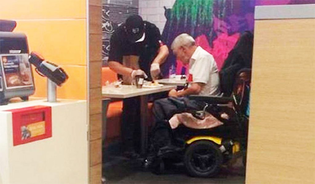 Atendente do McDonald’s fecha o caixa na hora do rush para ajudar um idoso deficiente a se alimentar
