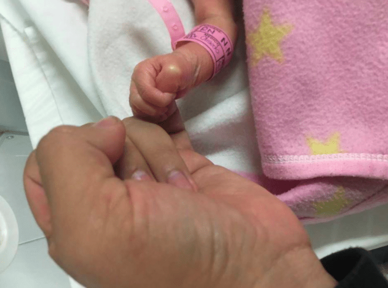Quando o pegaram no colo, perceberam que ele estava repleto de picadas com o cordão umbilical ainda preso. Pesando apenas dois quilos e sofrendo de hipotermia, o bebê finalmente recebeu a atenção que precisava.