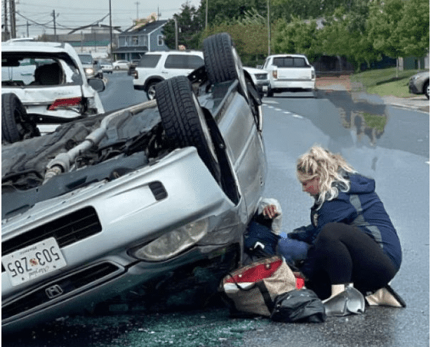 Para uma mulher grávida de Maryland, seu instinto de ajudar uma vítima de acidente de carro era tão forte que não importava que ela estivesse quase pronta para dar à luz seu próprio bebê.