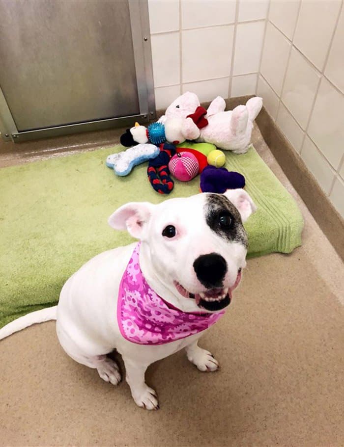 Baby tem sete anos de idade e foi abandonada em um refúgio no Condado de Montgomery, em Derwood, Maryland. No chamado Montgomery County Animal Services & Adoption Center, seus gemidos são ouvidos por todos. A administradora de programas do local, Hannah Carl, “Ela tem uma pequena colocação de brinquedos em seu canil e com muita alegria ela os mostrará para você para passar tempo com ela.”