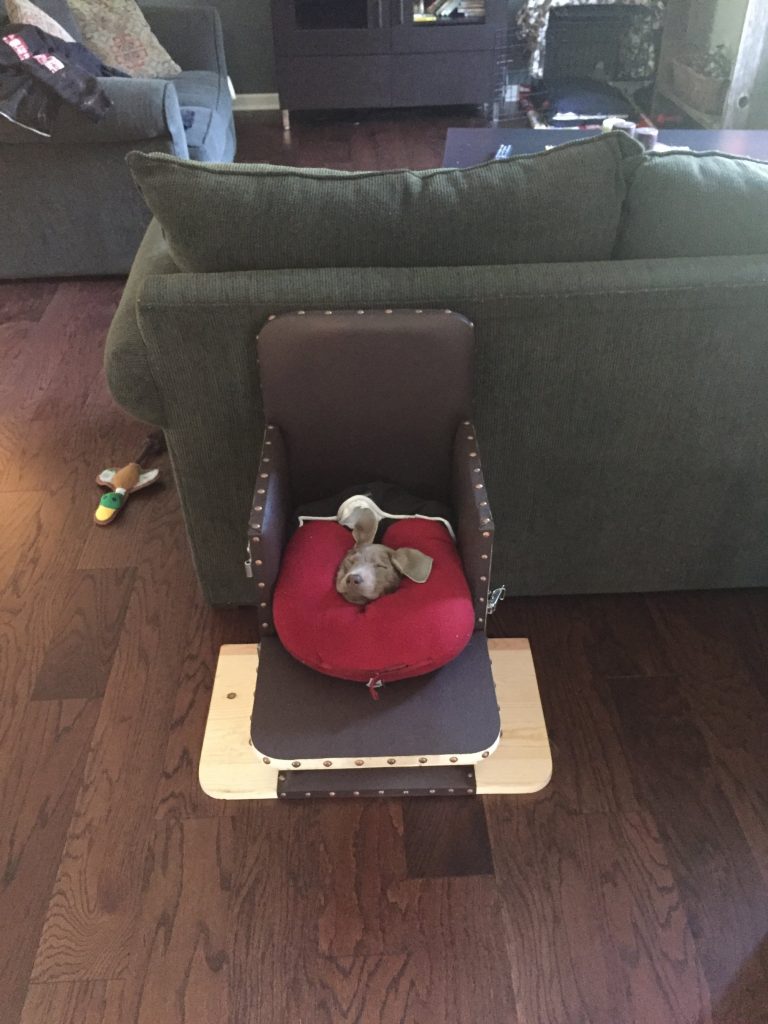 Após diversas tentativas do que poderiam fazer para ajudá-la a conviver com isso, a família decidiu comprar uma cadeira de refeição. Isso mesmo! Assim como cadeiras usadas por bebês na hora de se alimentar, a pequena cadelinha também ganhou uma.