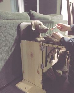 Após diversas tentativas do que poderiam fazer para ajudá-la a conviver com isso, a família decidiu comprar uma cadeira de refeição. Isso mesmo! Assim como cadeiras usadas por bebês na hora de se alimentar, a pequena cadelinha também ganhou uma.