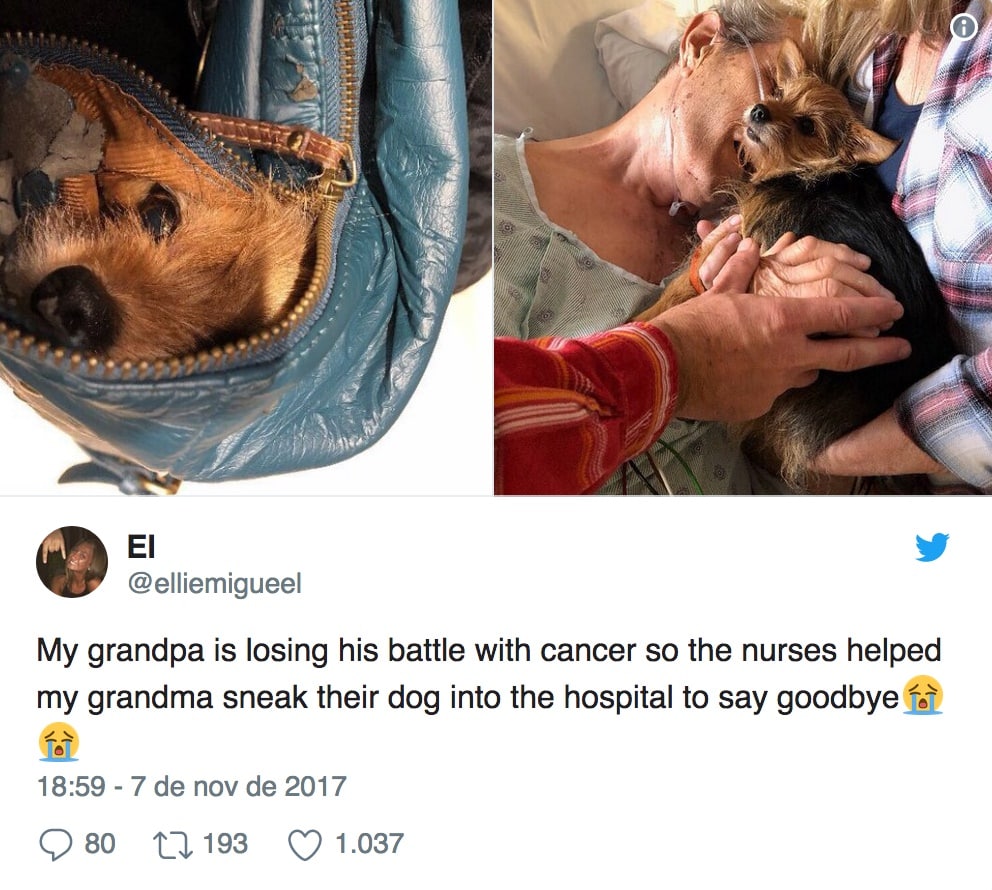 Infringindo as leis do hospital, que não aceita a entrada de animais, ela escondeu a cadelinha, Lil Fee, em uma bolsa ao entrar. Algumas enfermeiras ficaram comovidas com a história e acabaram ajudando a família.