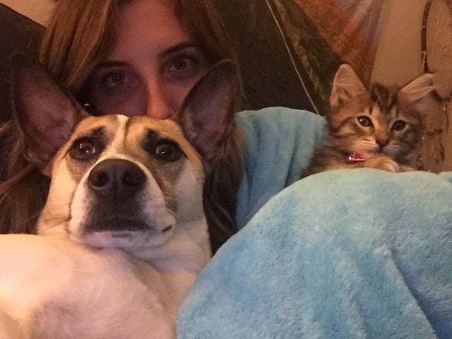 Kitty era solitária, assim como Lady já havia sido. Mas mesmo antes de trazer gatinha para casa, Samantha teve certeza de que sua “filha” receberia o felino com as patas abertas. “Antes de ter Kitty, Lady teve um caso de amor com os gatos do meu vizinho, Penny e Bruce … Lady cheirava constantemente, lambia e tentava brincar com eles. Nossos apartamentos eram em frente um do outro, então Lady olhava ansiosamente para fora da nossa janela e esperava que um deles se sentasse no peitoril da janela e olhasse para trás. Então, nós sempre soubemos que Lady seria apaixonada por uma gatinha própria”.