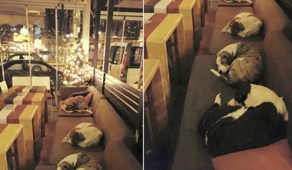 Um café generoso na Grécia está permitindo já há algumas semanas que cachorros de rua passem a noite dentro do estabelecimento longe do frio congelante do país.
