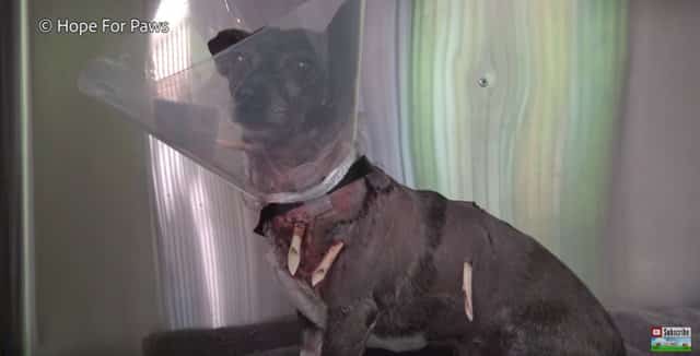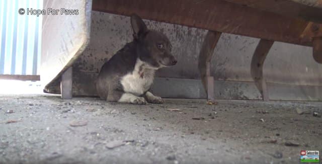 Após a equipe da ONG ‘Hope for Paws’ ser chamada, os socorristas encontraram o animal descansando em um cobertor ao lado de uma cerca. Mas imediatamente após alguém se aproximar, Hugo se desesperou. Visivelmente assustado, o cãozinho mal conseguia se mover. Ele nem conseguia ficar de pé.