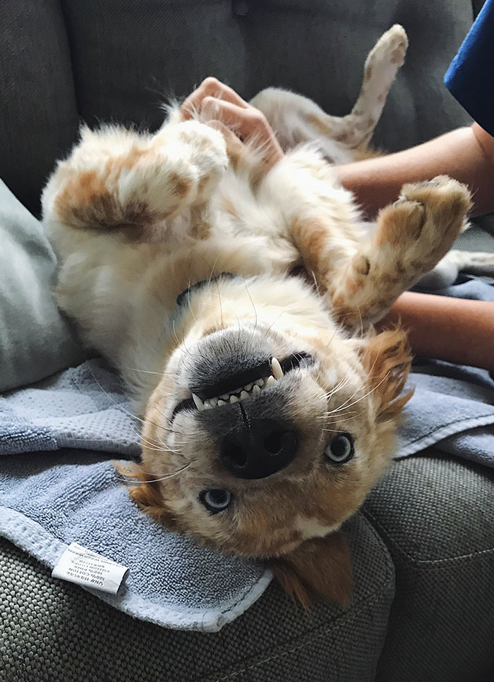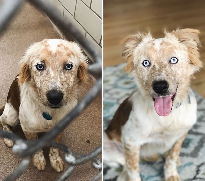 O que mais chamou a atenção, no entanto, foram aqueles lindos olhos azuis que no abrigo estavam tristes, mas mudam 100% assim que ele foi adotado e ganhou uma casa para chamar de sua.