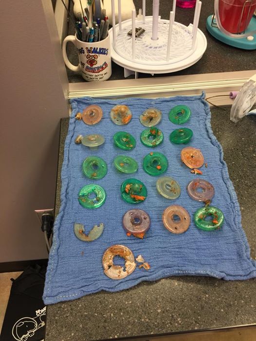 “Por isso aviso, algumas pessoas podem achar as seguintes fotos perturbadoras !! Eu tenho que mostrar por dois motivos, primeiro, essa foi a cirurgia mais fascinante e excitante que já fiz ou minha equipe já fez parte. Nós adoramos Dovey, e ela está fazendo um ÓTIMO pós-operatório. Dr. Papai (que, aliás, fraturou minha testa no ano passado, quando um ventilador caiu da prateleira da garagem no meu rosto !!!) e mamãe recentemente tiveram uma segunda criança linda, mas estavam com um dilema sobre onde estavam suas chupetas, então a avó viu Dovey pular em um balcão e pegar uma. Ela recentemente ignorou sua comida e vomitou um pouco por alguns dias, mas, além disso, estava agindo bem. Quando ela vomitou uma chupeta, além da história da avó, papai trouxe-a para um raio-x. Você podia ver a chupeta em seu estômago, nós contamos 7-9. Bem… … no final da cirurgia, tiramos 21 do estômago dela. Esse é o segundo, e mais importante, porque compartilho essas fotos. Cachorros comem qualquer coisa, a qualquer hora e a qualquer idade, por isso devemos sempre estar atentos !!! Agradeço ao Dr. Papai e a mãe por me deixar compartilhar isso com os clientes!!!”