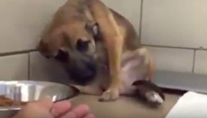 No entanto, uma mulher da organização A Place To Bark gravou o momento em que ela foi resgatá-lo, que foi a primeira vez que eles interagiram. Quando ela se aproximou, o cão se afastou até ficar colado na parede. O pequeno nunca soube o que era o amor, mas a mulher, com inteligência e experiência, sabia o que fazer.