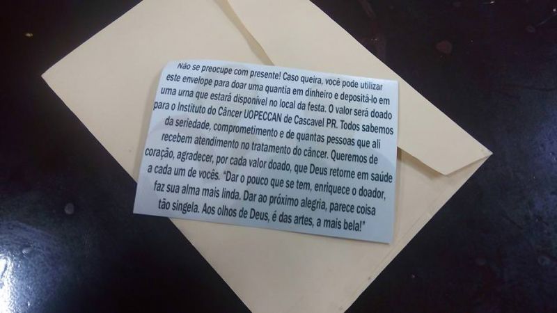 Ao invés dos presentes, eles distribuíram um envelope e assim, cada convidado fazia sua doação em dinheiro para o Uopeccan, um hospital da cidade que atende pacientes com câncer e depende de doações para ficar em pé.