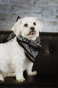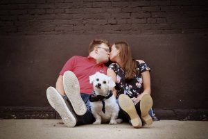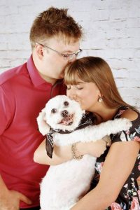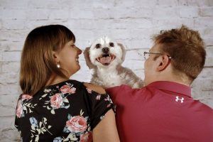A estrela das fotos foram seu filho, Riley, um cãozinho de 11 anos. Ele foi adotado pelo casal em Iowa, Estados Unidos, quando tinha seis anos e, desde então, é o filho único.