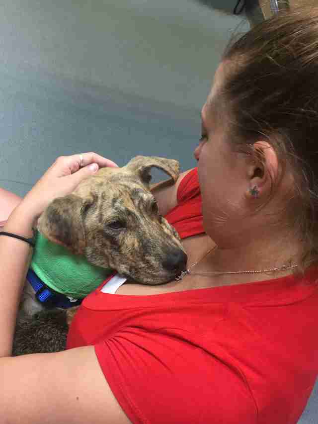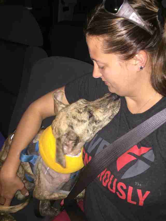 Assim que chegou mais perto, a mulher viu o que parecia ser uma espécie de colar no pescoço do animal. Contudo, quando ela pediu ao marido Sean para pegar uma coleira, a observação mais aprofundada a fez perceber que na verdade o pobrezinho estava ferido. Se tratava de um cão, que por sinal, estava com mais medo do que ela. “Nessa hora, comecei a chorar”, disse Laura.