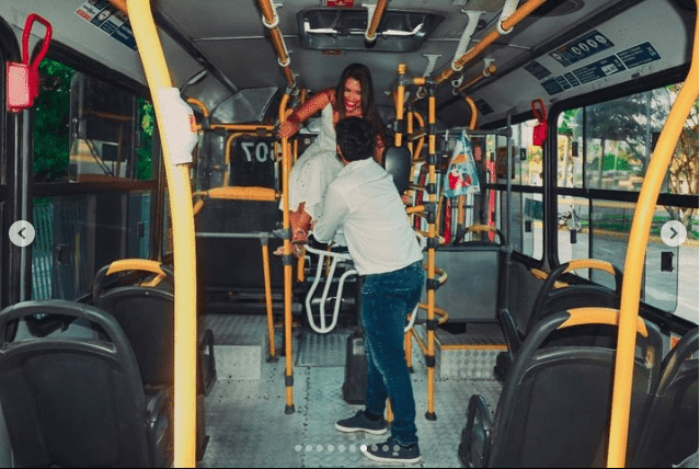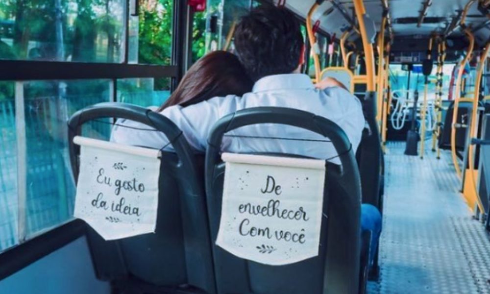 Entre as poses, o casal aparece comprando pipoca no terminal, pulando a catraca do coletivo e até fingindo dormir sentados no ônibus, como faziam quando eram universitários voltando para casa após um dia exaustivo.