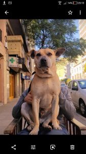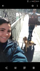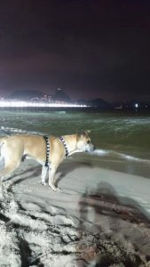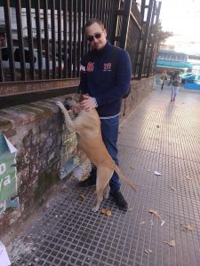 Nesse momento ele pulou como se reencontrasse os donos perdidos. Algumas horas depois já tínhamos lhe dado nome, coleira, comida e água e pesquisávamos sobre como levá-lo ao Brasil. Fomos num veterinário que disse de má vontade que o processo seria complicado e burocrático demais, não valia a pena e era melhor levá-lo a um abrigo. Mas não conseguimos desistir dele. Fomos ao hotel perguntar se ele poderia ficar no quarto com a gente, mas o tamanho não permitiria, então instalei o aplicativo chamado DogHero para encontrar uma anfitriã que ficasse com ele por alguns dias, e contamos a ela a história.