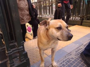 No caminho encontramos um cachorro abandonado e paramos para fazer carinho (como fazemos normalmente). Ele deitou no chão e ficou de barriga para cima pedindo por mais carinho. Ele era amigável e carinhoso mas tinha um ar triste e sombrio no olhar. Era de médio porte, castrado, parecia sem raça definida e tinha marcas de arranhões nos rosto. Meu namorado ficou insistindo para irmos logo, então nos despedimos e seguimos nosso caminho. Dois quarteirões depois nos demos conta que ele nos acompanhava. Entramos numa das manifestações que passava, para tentar despistá-lo e corremos sem ele perceber, mas de longe vimos como ficou desnorteado e não resistimos a correr de volta ao seu encontro.