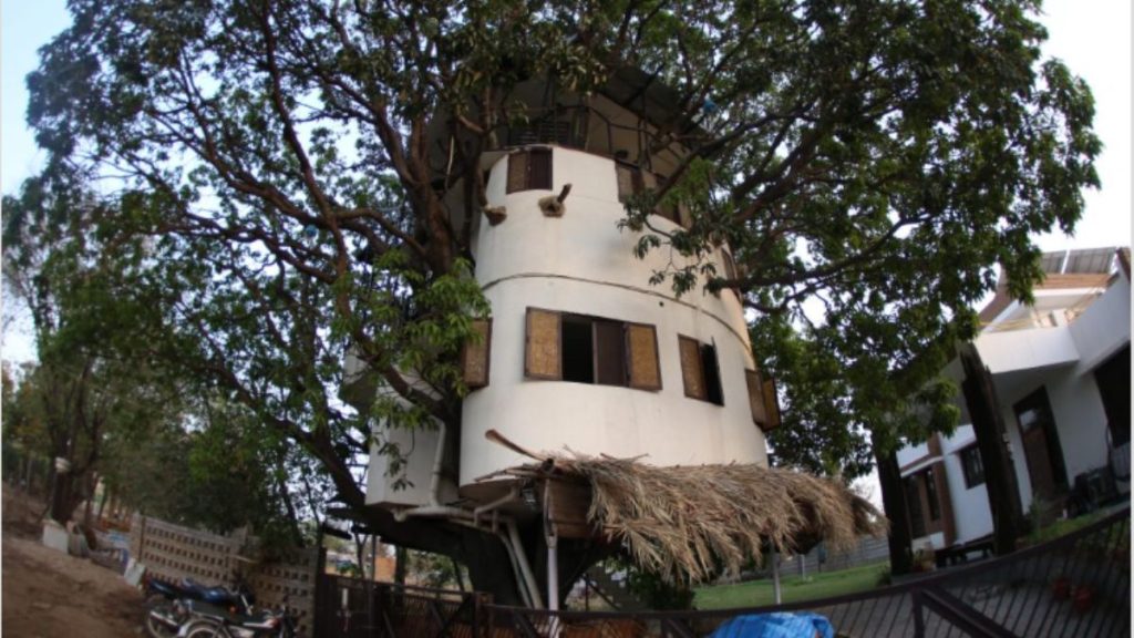Agora, o tronco grosso da árvore de 150 anos é a característica central de sua residência, crescendo no meio do edifício na cidade de Jabalpur.