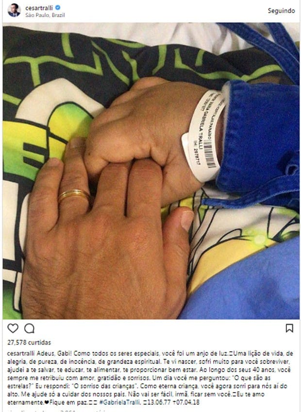 “Adeus, Gabi! Como todos os seres especiais, você foi um anjo de luz. Uma lição de vida, de alegria, de pureza, de inocência, de grandeza espiritual. Te vi nascer, sofri muito para você sobreviver, ajudei a te salvar, te educar, te alimentar, te proporcionar bem estar. Ao longo dos seus 40 anos, você sempre me retribuiu com amor, gratidão e sorrisos. Um dia você me perguntou: “O que são as estrelas?” Eu respondi: “O sorriso das crianças”. Como eterna criança, você agora sorri para nós aí do alto. Me ajude só a cuidar dos nossos pais. Não vai ser fácil, irmã, ficar sem você. Eu te amo eternamente. Fique em paz.#GabrielaTralli. 13.06.77 ✝07.04.18”, escreveu ele.
