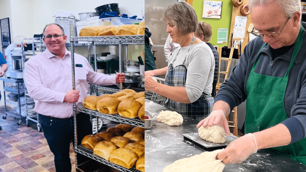 Qualquer pessoa pode se inscrever para aprender a fazer pão caseiro no banco de alimentos Greener Village de Fredericton . Os voluntários conversam em torno de uma mesa coberta de farinha enquanto fazem cerca de 200 pães às segundas-feiras e depois levam para casa um pão fresco e dourado.