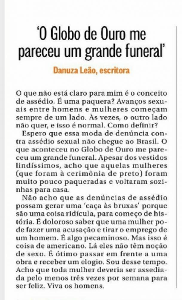 A jornalista, escritora e ex-modelo Danuza Leão emitiu sua opinião publicamente no jornal O Globo e foi alvo de diversas críticas. Ela começou se perguntando exatamente o que seria o assédio. É uma espécie de paquera? Ela diz que “Avanços sexuais entre homens e mulheres começam sempre de um lado. Às vezes, o outro lado não quer, e isso é normal. Como definir?”