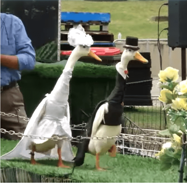 Durante o desfile, os patos modelam três looks: diurno, noturno e de casamento.