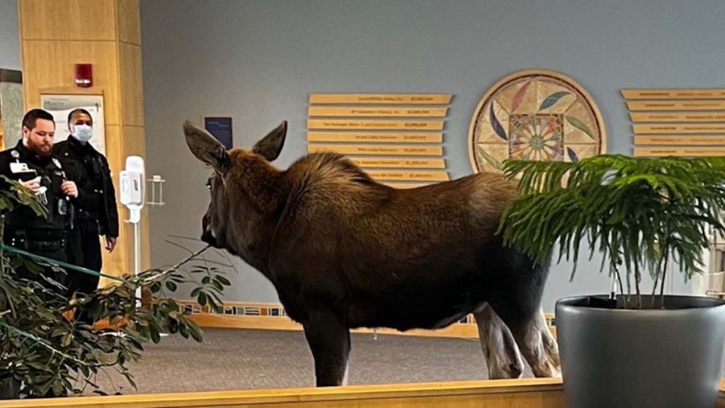 Desejando um lanche da folhagem no centro de câncer do Providence Alaska Health Park, em Anchorage, foi na última quinta-feira que um alce decidiu entrar no prédio.