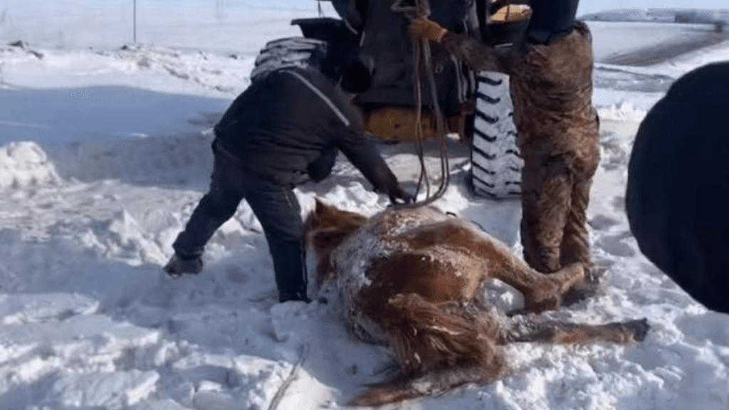 Um homem na Mongólia Interior, na China, fez de tudo para resgatar uma égua grávida que estava presa em um buraco profundo na neve.