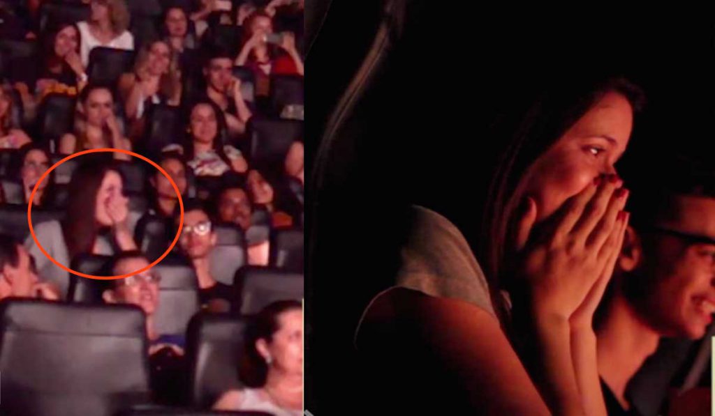 Ela vai ao cinema e fica paralisada ao ver que o trailer é um pedido oficial de casamento