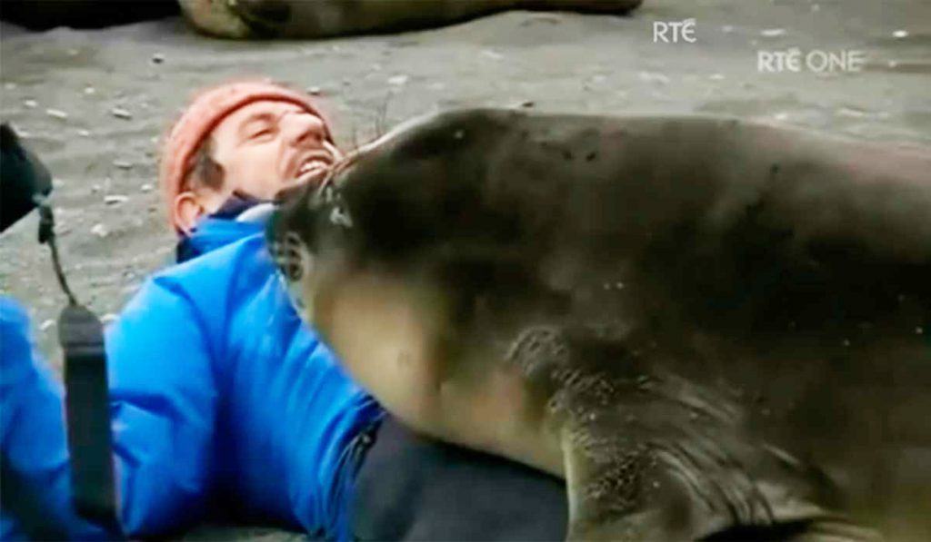 Ele é surpreendido ao ser abordado por uma foca. O que ela faz com ele é fora do comum