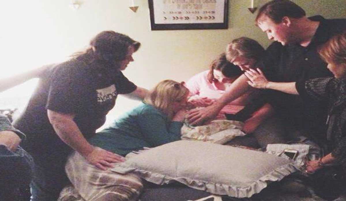 A foto abaixo mostra familiares e amigos com a mão na barriga de Hannah, orando pelo futuro do bebê.