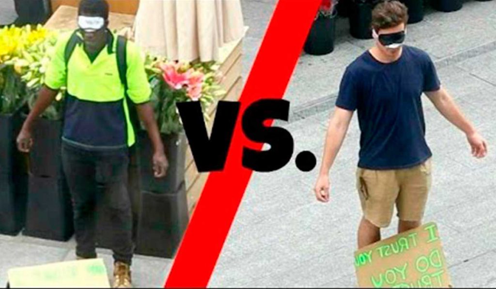 Nele, dois atores, um branco e outro negro, seguram cartazes escritos “Eu confio em você. Você confia em mim?”