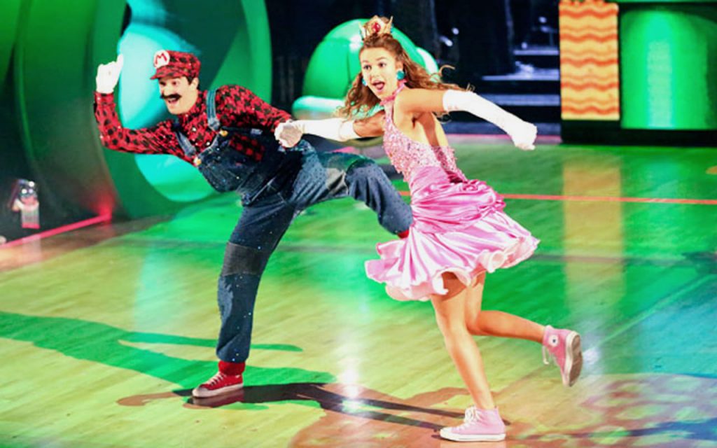 Fantasiados da princesa Peach e do Mario, as estrelas Sadie Robertson e o dançarino Mark Ballas coreografaram a trilha do game e embalaram todos os ritmos que tinham direito: salsa, balé, hip hop e tango!