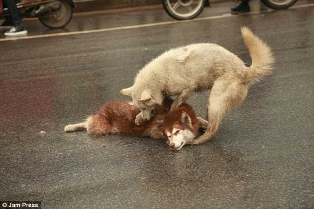 Em uma estrada chinesa, um pobre cão não resistiu aos ferimentos após ser atropelado e acabou falecendo. O acontecimento, triste por si só, ganhou comoção ainda maior quando um outro cachorro tentou ressuscitá-lo. O amigo, apesar da tristeza e do abatimento, não desistia de sua missão e fazia de tudo para reanimá-lo ao mesmo tempo em que guardava o seu corpo, mas infelizmente, não foi possível salvá-lo.