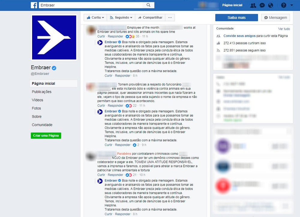 Uma grande polêmica tomou conta das redes sociais da fabricante de aviões Embraer. A empresa foi duramente criticada por internautas após um funcionário usar seu perfil pessoal para pedir dicas de como matar um gato em uma página. Na postagem, o empregado, que atua como eletricista, citou que gostaria de um método lento e doloroso para torturar o bichano antes de matá-lo.