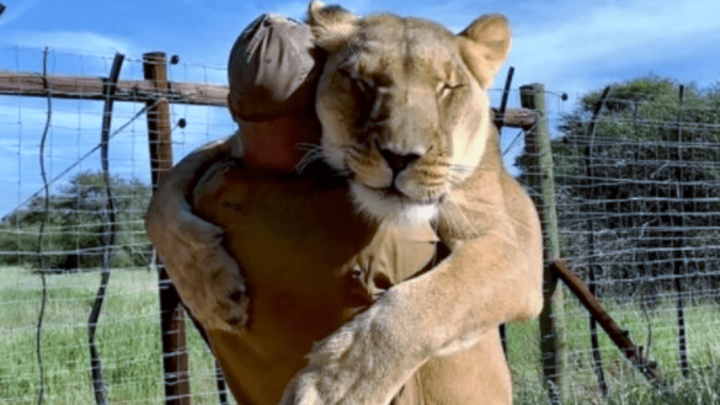 Essa leoa não para de abraçar o homem que salvou sua vida!
