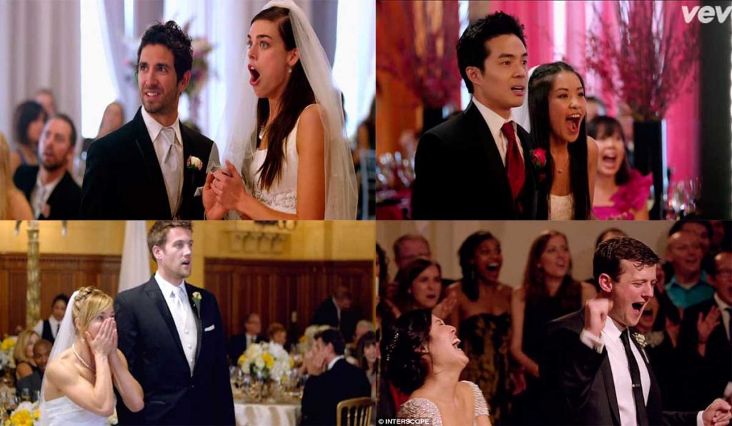 ‘Hoje é 6 de dezembro de 2014, e nós vamos dirigir por Los Angeles e invadir o maior número de casamentos que a gente conseguir. Vai ser demais’, anuncia o vocalista da banda Maroon 5 no início do clipe Sugar.