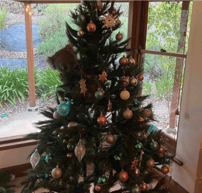 Um coala real estava alojado na árvore de Natal na sala de estar! Sem dúvida não é algo comum nem mesmo na Austrália.
