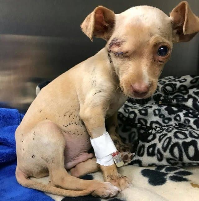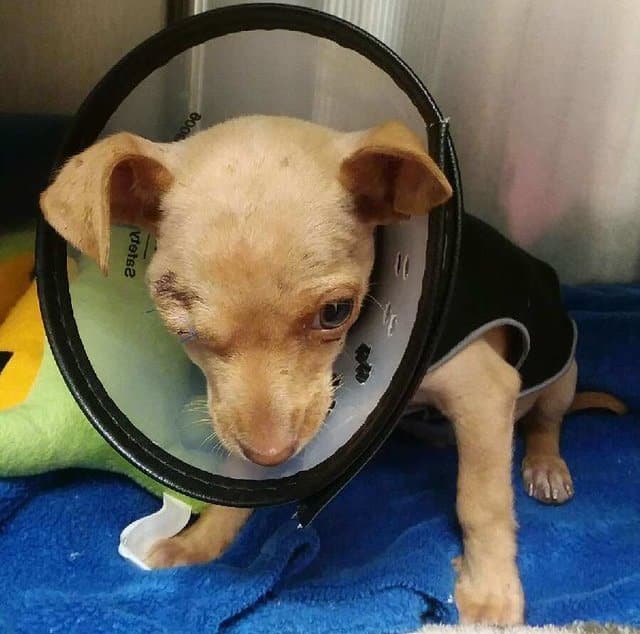 De acordo com os profissionais, as feridas que o filhote tinha no corpo haviam sido causadas por outros cachorros. No entanto, o mais preocupante era o olho do pequeno, que estava praticamente todo para fora e com uma grave infecção.