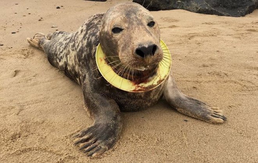 Ela foi resgatada na costa leste da Inglaterra com um objeto de plástico semelhante a um frisbee em seu pescoço. O animal tinha o anel no pescoço há pelo menos seis meses, mas os protetores só conseguiram tirá-lo do mar quando ele já tinha o machucado e sufocado muito.